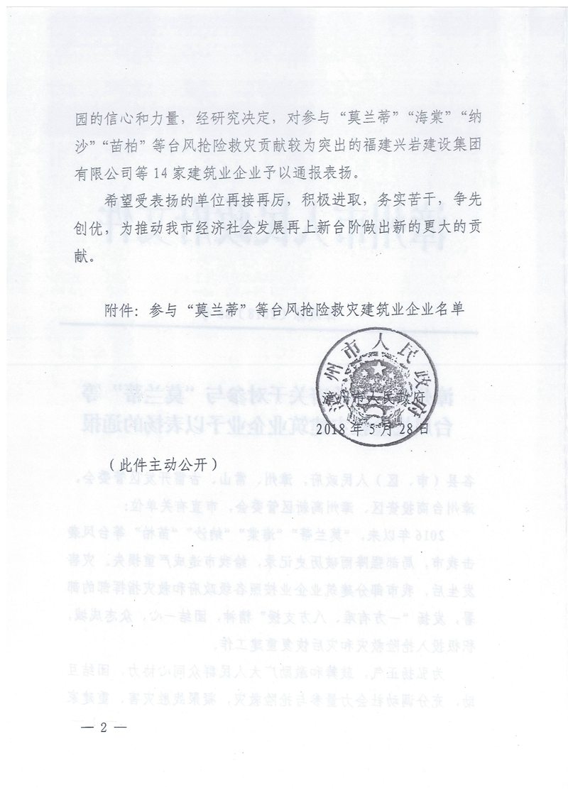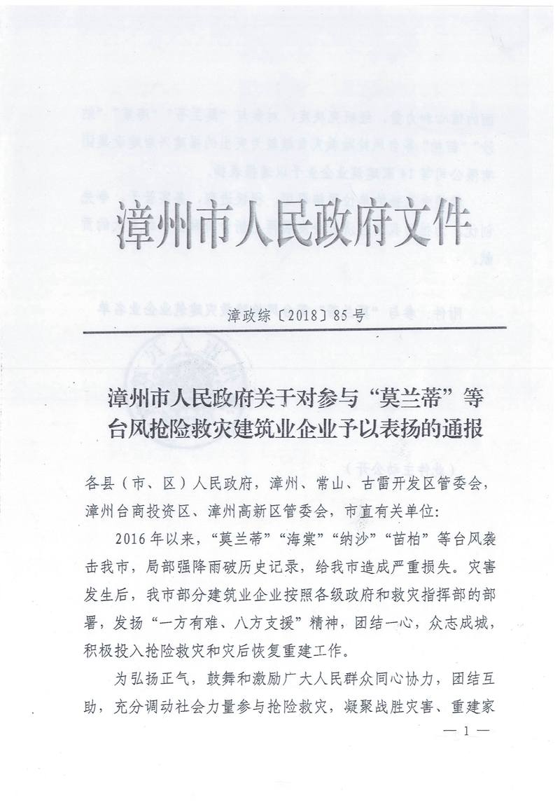 近日,漳州市人民政府發(fā)文,對(duì)參與 “莫蘭蒂”等臺(tái)風(fēng)搶險(xiǎn)救災(zāi)建筑企業(yè)予以通報(bào)表揚(yáng),我集團(tuán)在搶險(xiǎn)救災(zāi)中貢獻(xiàn)較為突出名列其中,為集團(tuán)在信用評(píng)價(jià)體系獲得了加分機(jī)會(huì),這是我集團(tuán)贏得的一項(xiàng)新榮譽(yù)。