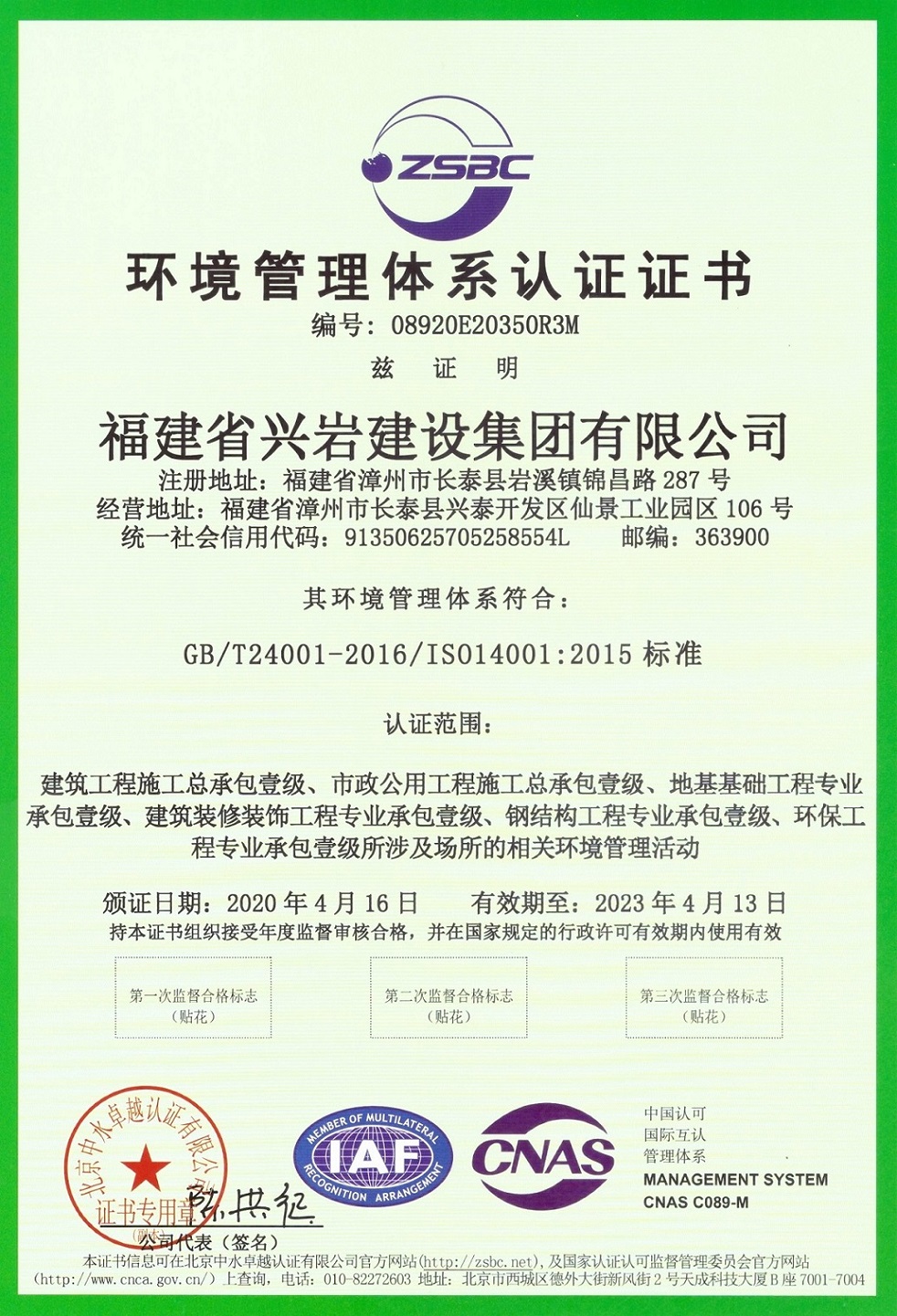 環(huán)境管理體系認證證書