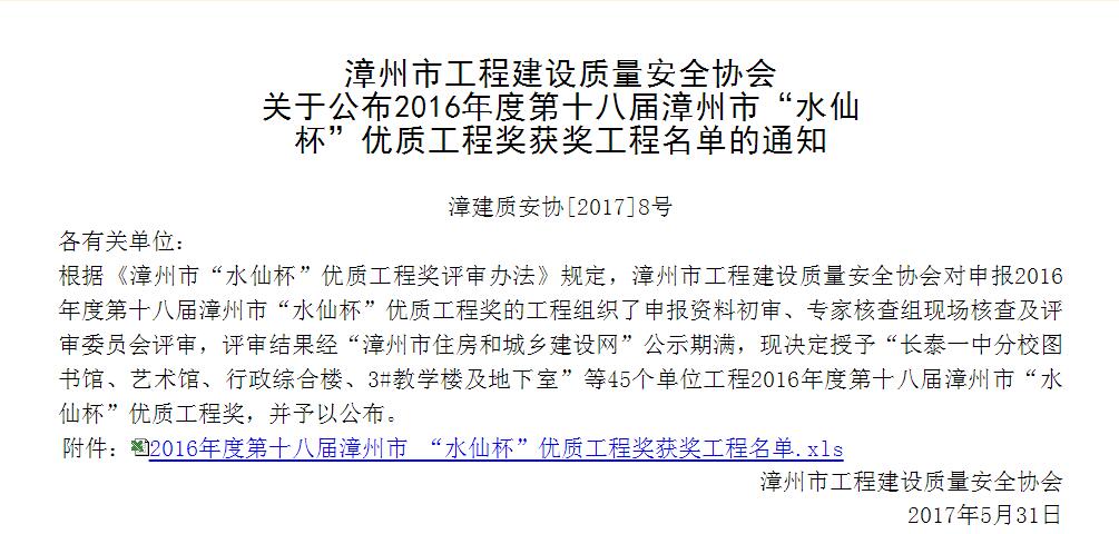 日前,漳州市工程建設(shè)質(zhì)量安全協(xié)會根據(jù)《漳州市“水仙杯”優(yōu)質(zhì)工程獎(jiǎng)評審辦法》規(guī)定,對申報(bào)2016年度第十八屆漳州市“水仙杯”優(yōu)質(zhì)工程獎(jiǎng)的工程組織了申報(bào)資料初審、專家核查組現(xiàn)場核查及評審委員會評審并經(jīng)公示期滿,由我集團(tuán)承建的“長泰一中分校圖書館、藝術(shù)館、行政綜合樓、3#教學(xué)樓及地下室”工程項(xiàng)目榮獲2016年度第十八屆漳州市“水仙杯”優(yōu)質(zhì)工程獎(jiǎng)。